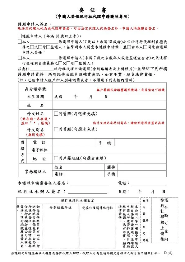 囗(父母離異者 或 單親者,需另附有記載監護人之三個月內戶籍謄本正本)舊護照(效期不足需重新申辦者舊護照必需繳回)
